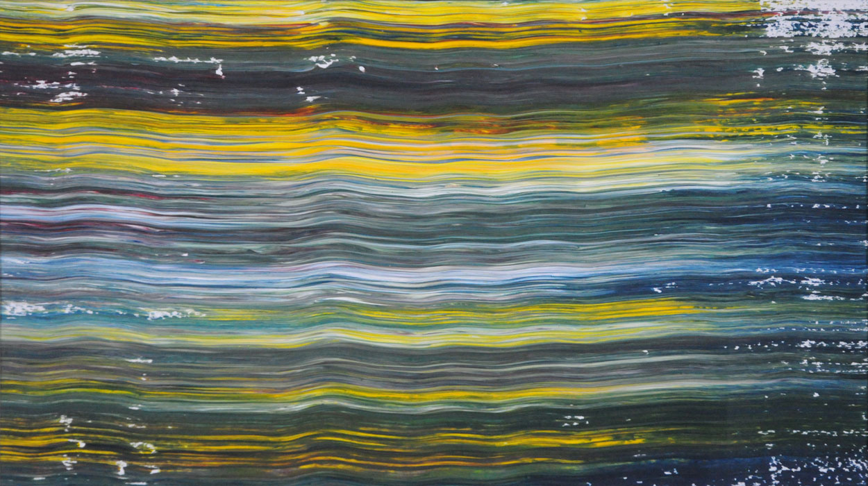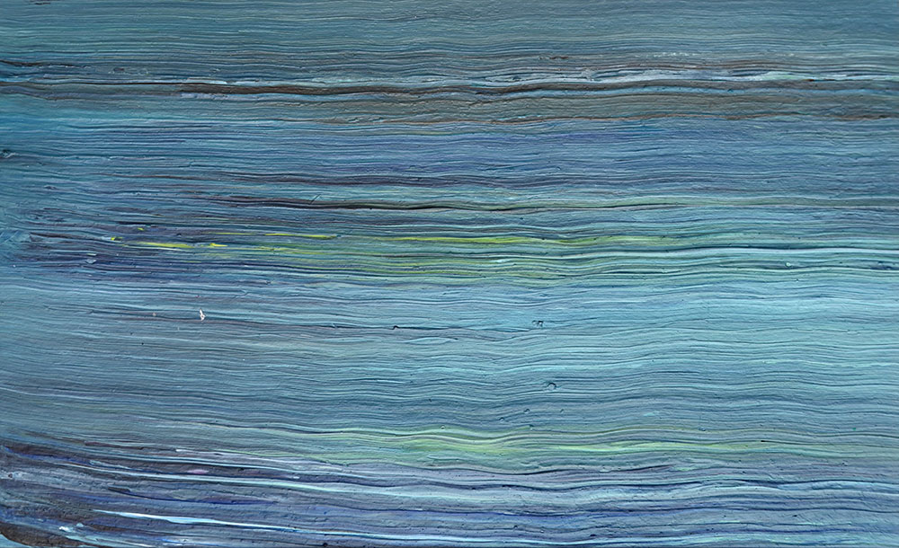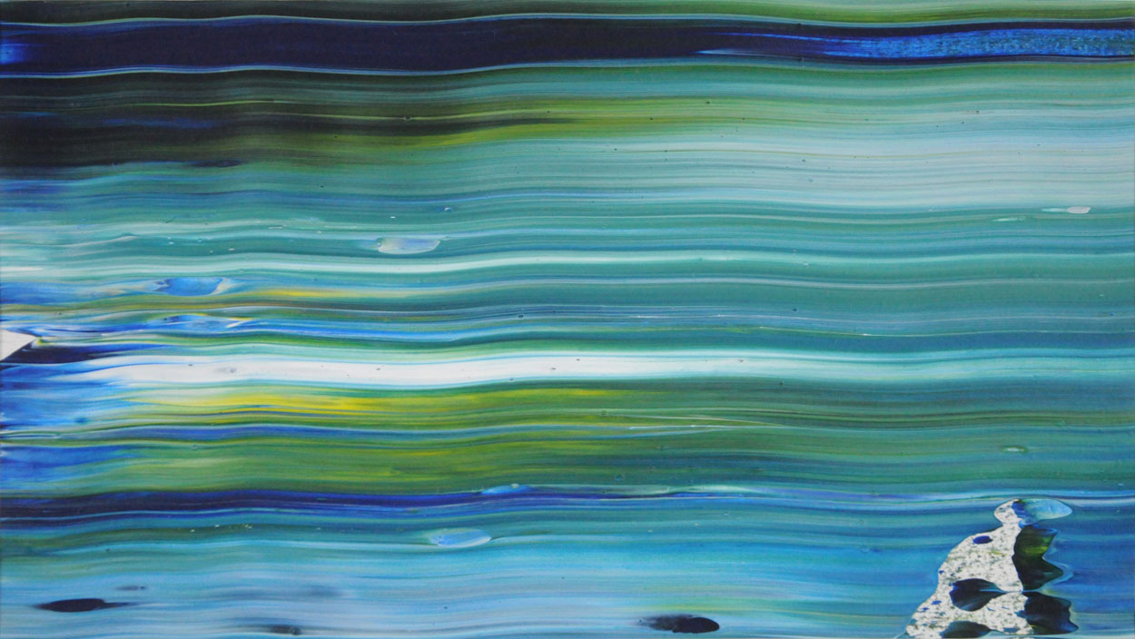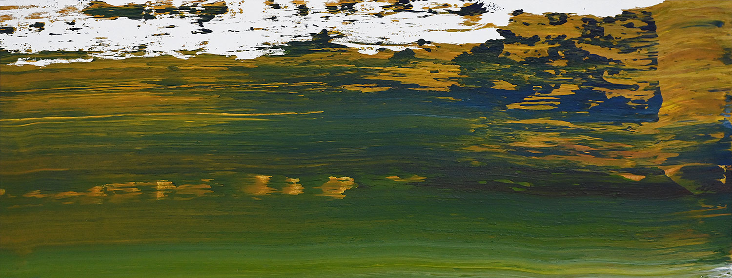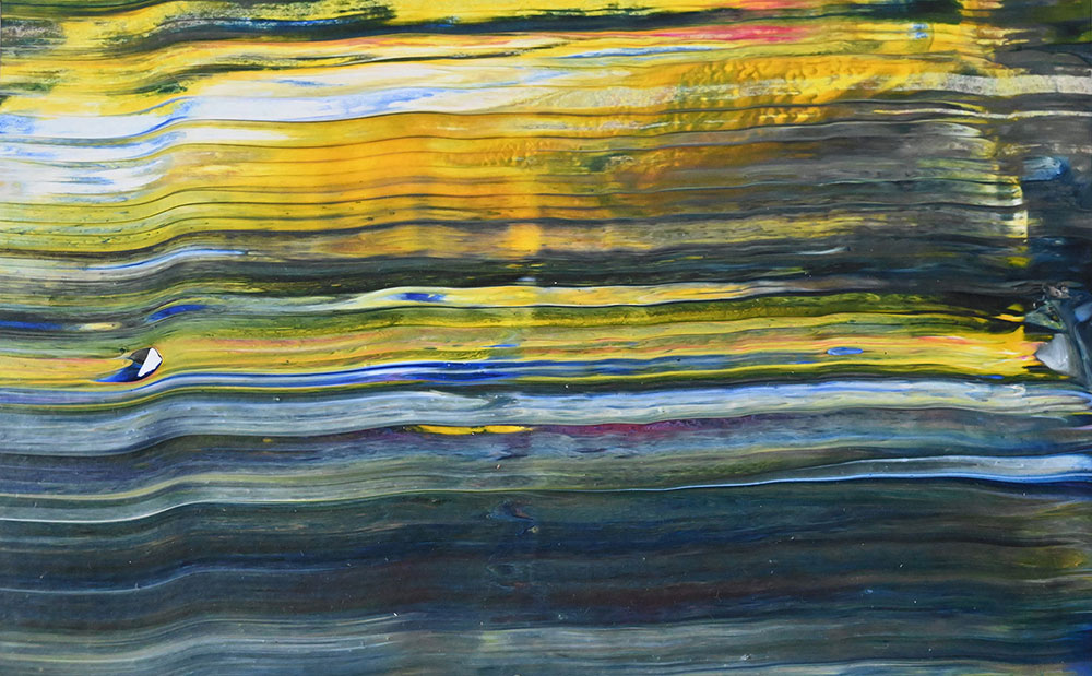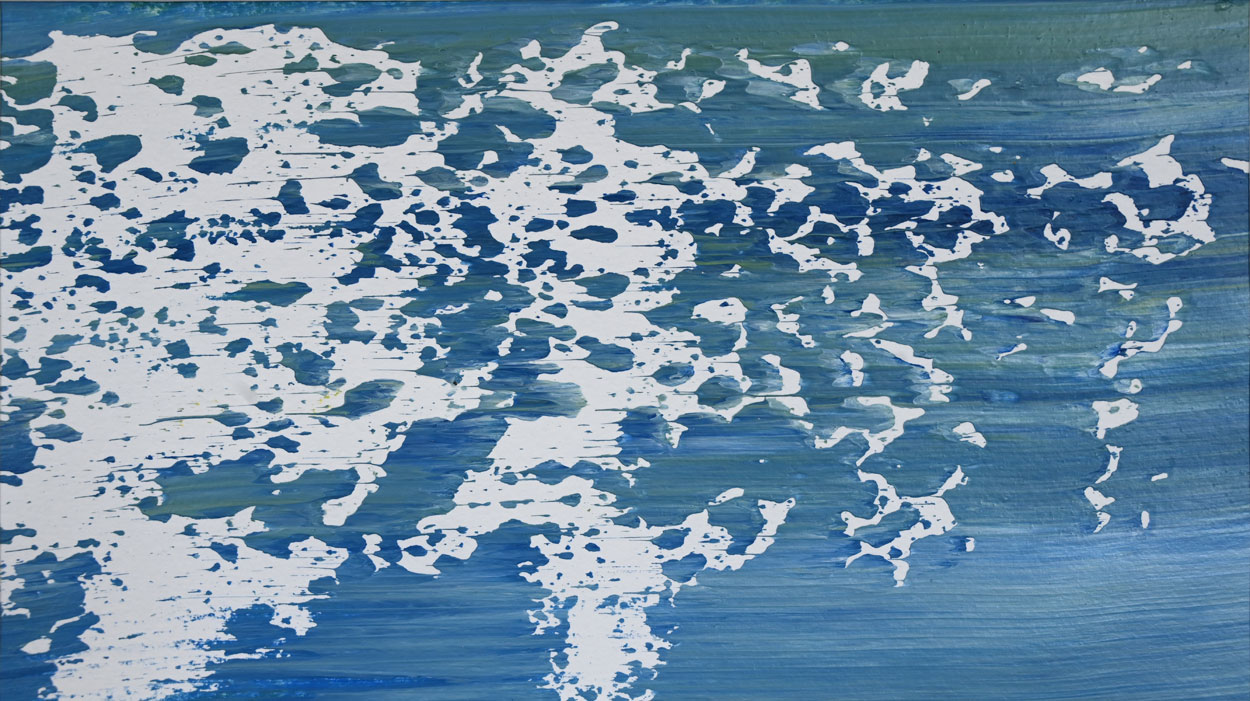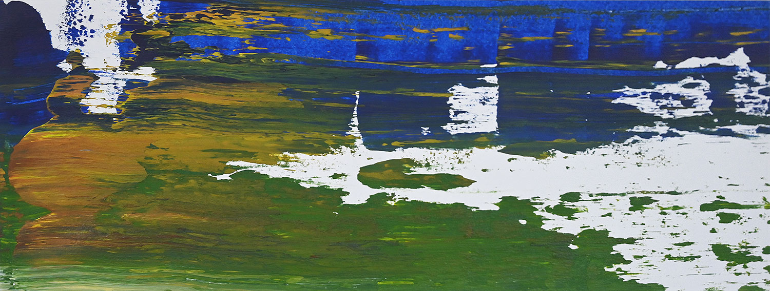 Door de jaren heen maak ik veel middelgrote en kleine Waterwerken in acryl op papier. Op kleiner formaat kun je makkelijker experimenteren. Een deel van die uitprobeersels kan direct weg, maar er is soms ook interessant werk bij. Deze kleinere werken zijn soms met de kwast, soms met paletmes en soms met een houten balk geschilderd.